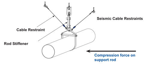 Transverse restraints may be either cables or struts. Although they look similar, they behave very differently in practice. Cables carry only tension loads (cables cannot be pushed). Struts carry both tension and compression loads.
